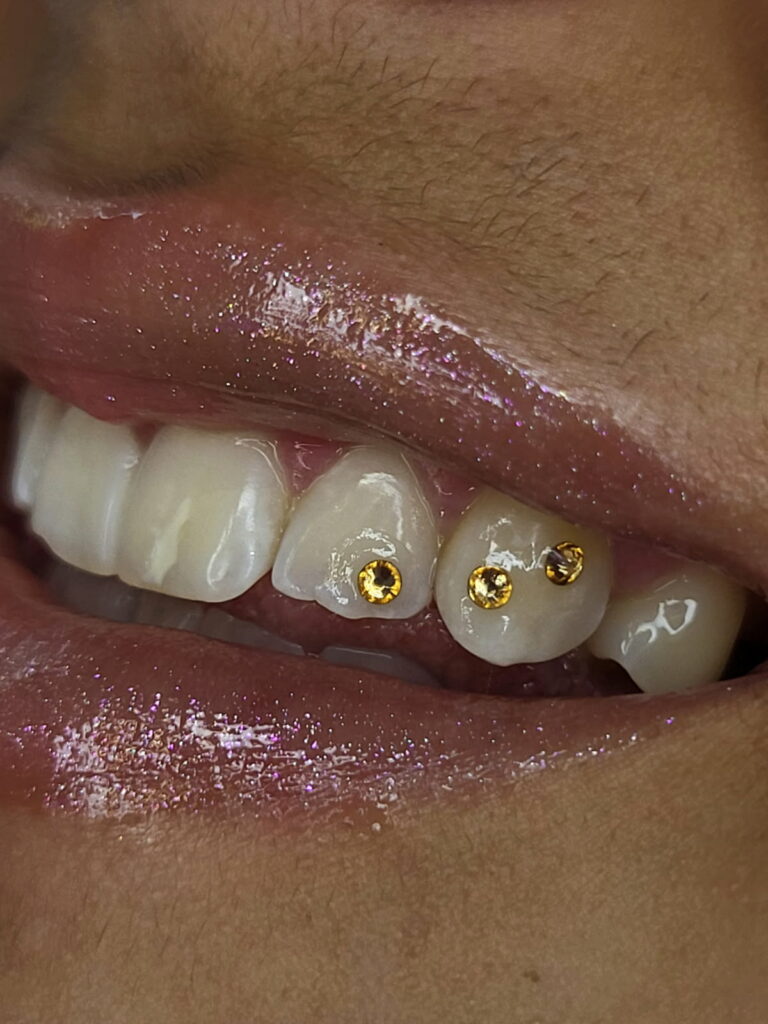 Le protocole de pose est semblable à celui d’un appareil dentaire.Les strass sont appliqués sur la surface de ta dent, sans risque de trace ou d’abîmer ton émail.